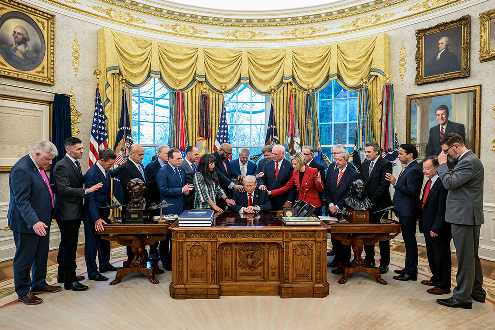 Twenty evangelical pastors gather around U.S. President Donald Trump in the Oval Office to pray for the success of the Iran War — Friday, March 6, 2026