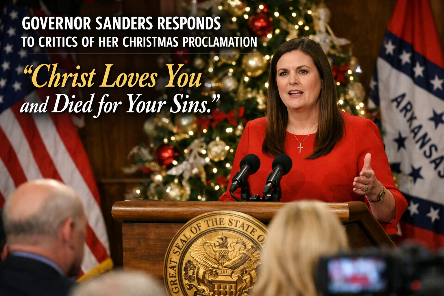 Arkansas Governor Sarah Huckabee Sanders responded to her critics who questioned her authority and motives for issuing an official faith proclamation calling on state workers to honor Christ by granting them an additional paid day off on December 26 to celebrate the birth of Jesus. Rather than backing down under accusations of using her position as governor to proclaim Christian theology as part of an official state function, Sanders doubled down—using her office of governorship to unapologetically affirm on official state letterhead that Jesus loves even her critics and that he died for their sins too. [1]