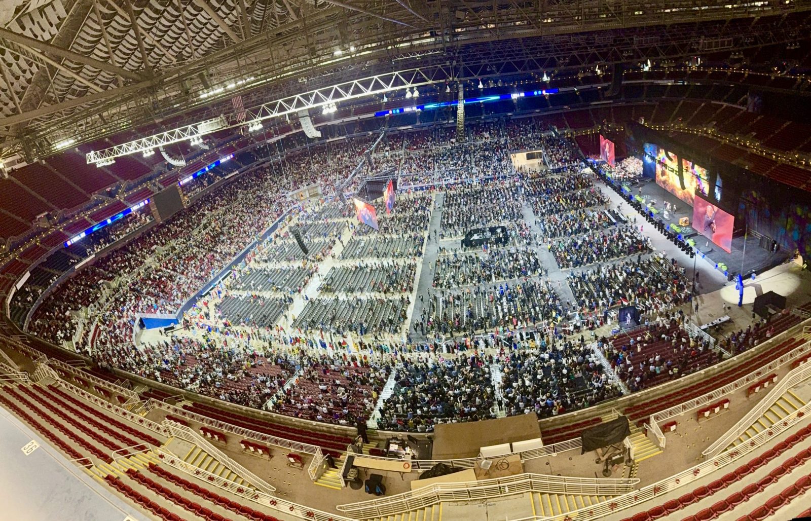 During the ceremony that featured flags from countries representing the church’s global region at this 62nd General Conference Session, I was seated up by the rafters and had a bird’s-eye view of the entire program. Even though I was so high up, I could still see everything with a zoom lens. And for the glory of God, Rome’s flag was gone.
