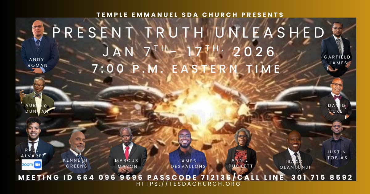 From January 7 to 17, 2026, at 7:00 p.m. Eastern Time, join believers around the world for the annual 10 Days of Prayer, a global Adventist experience focused on spiritual renewal, revival, and a deeper walk with God. Present Truth Unleashed will be a powerful Zoom event and a season of prayer, praise, and present truth as churches, small groups, and individuals unite to seek God’s presence in a meaningful and transformative way. Join us. Invite a friend. All are welcome.